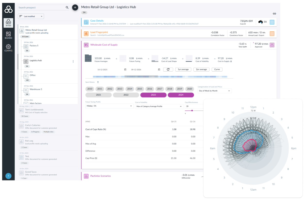 - Harness your data: Model and quote from custom load profiles or from a library of 20,000+ profiles that come integrated with the product. Overlay these with renewable energy offsets to model complex energy contracts. Rich visual dashboards give your teams the insight needed to price with precision.